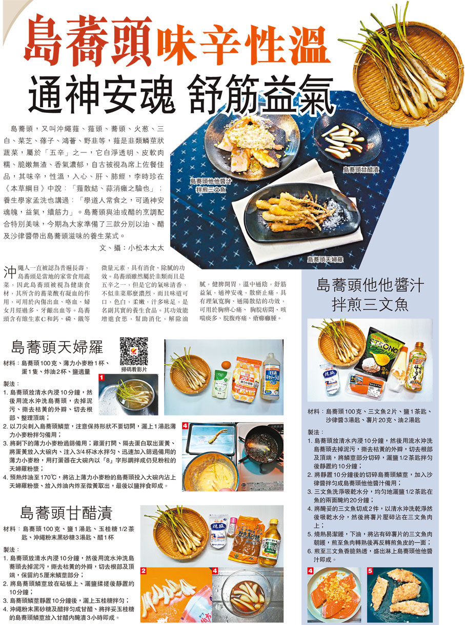 島蕎頭,又叫沖繩薤、薤頭、蕎頭、火葱、三白、菜芝、蓧子、鴻薈、野韭等,薤是韭類鱗莖狀蔬菜,屬於「五辛」之一,它白淨透明、皮軟肉糯、脆嫩無渣、香氣濃郁,自古被視為席上佐餐佳品,其味辛,性溫,入心、肝、肺經,李時珍在《本草綱目》中說:「薤散結、蒜消癥之驗也」﹔養生學家孟洗也講過:「學道人常食之,可通神安魂魄,益氣,續筋力」。島蕎頭與油或醋的烹調配合特別美味,今期為大家準備了三款分別以油、醋及沙律醬帶出島蕎頭滋味的養生菜式。 ●文、攝︰小松本太太