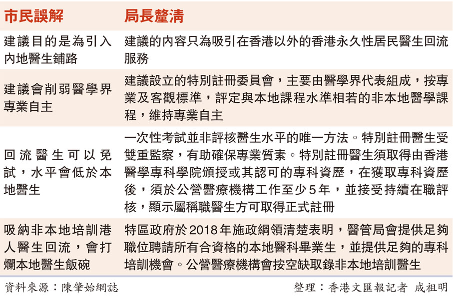 香港醫療需求殷切,為解決醫生人手問題,特區政府擬讓合資格的非本地培訓的港人醫生回港服務。食物及衞生局局長陳肇始昨日於網誌表示,增加本地醫生培訓學額訓練醫生需時,擴張醫學院培訓容量亦有實際局限,故有迫切需要為合資格的非本地培訓醫生另闢蹊徑。她並釐清坊間對引入非本地培訓醫生的四大誤解(見表),包括指出做法並無「繞過」醫委會、對非本地培訓醫生的要求更嚴格等。●香港文匯報記者 成祖明