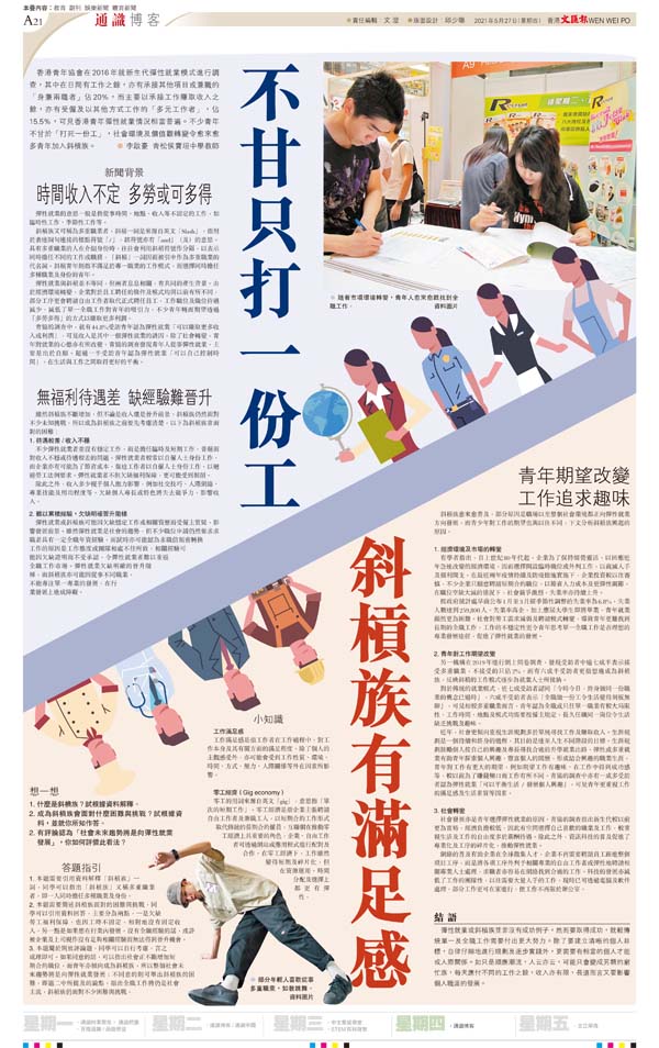 香港青年協會在2016年就新生代彈性就業模式進行調查,其中在日間有工作之餘,亦有承接其他項目或兼職的「身兼兩職者」佔20%,而主要以承接工作賺取收入之餘,亦有受僱及以其他方式工作的「多元工作者」,佔15.5%,可見香港青年彈性就業情況相當普遍。不少青年不甘於「打死一份工」,社會環境及價值觀轉變令愈來愈多青年加入斜槓族。 ● 李啟豪 青松侯寶垣中學教師