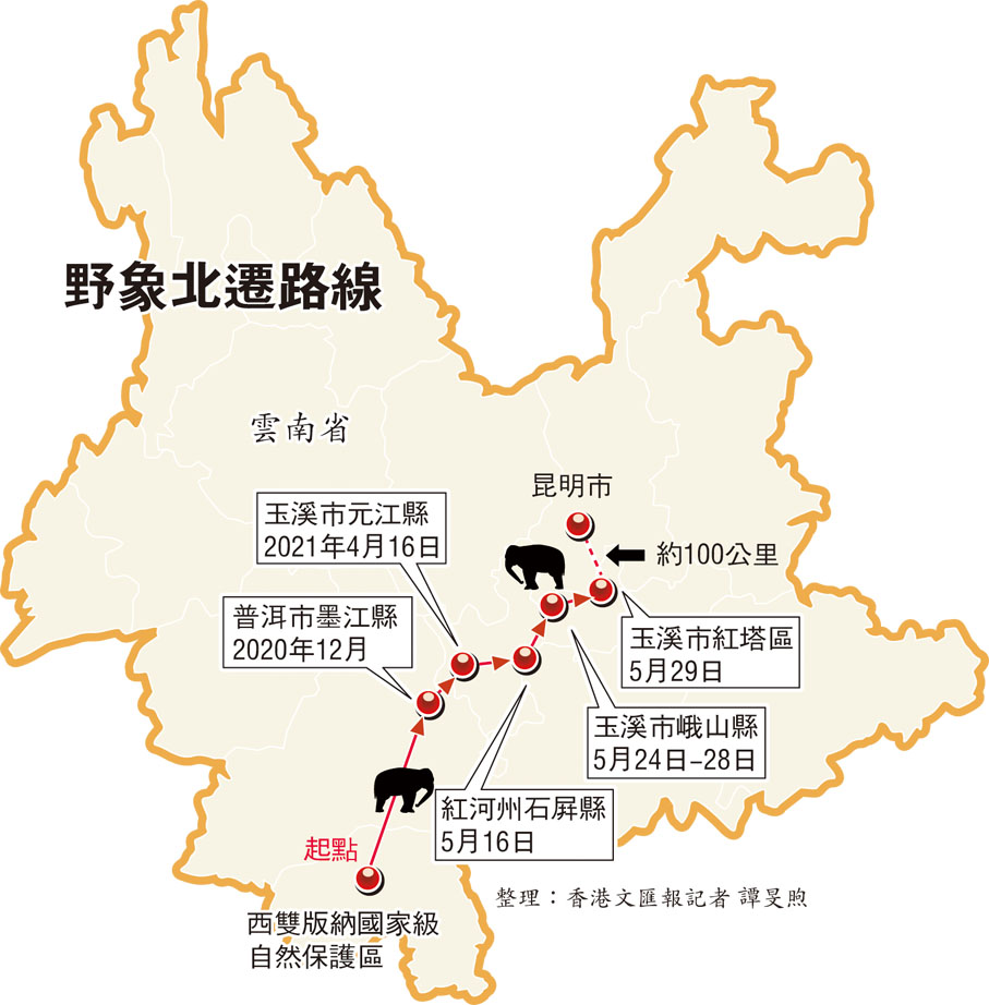 原本生活在雲南西雙版納原始森林裏的一群野生亞洲象,不久前開始向北進發,一路吃吃喝喝進了城,走過幾個城市之後,5月29日,這群野象已經到了離省會昆明不到100公里的地方。一時間,「放飛自我」的亞洲象成了城中熱話,民眾調侃牠們這是要來參加即將在昆明召開的聯合國生物多樣性大會,順便再搭個高鐵去北上廣逛逛。面對這一次亞洲象罕見的大範圍遷移,專家們正在想種種辦法「勸返」,而大象們似乎並無歸心,仍然繼續着牠們的「奇幻之旅」。●香港文匯報記者 譚旻煦 雲南報道