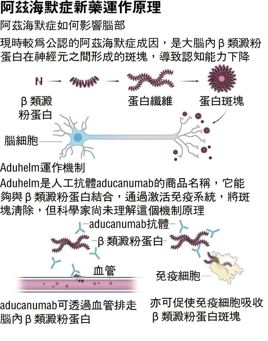 今次獲批的新藥由美國藥廠Biogen研發,商品名為Aduhelm(學名aducanumab,阿杜卡瑪單抗),它據稱能夠與阿茲海默症患者大腦中的Beta類澱粉蛋白沉積結合,然後通過激活免疫系統,將大腦中的沉積蛋白清除,從而治療因為阿茲海默症引起的輕度認知障礙和早期失智症狀。FDA表示,Aduhelm是第一種針對阿茲海默症病理生理學基本病因研發的藥物。