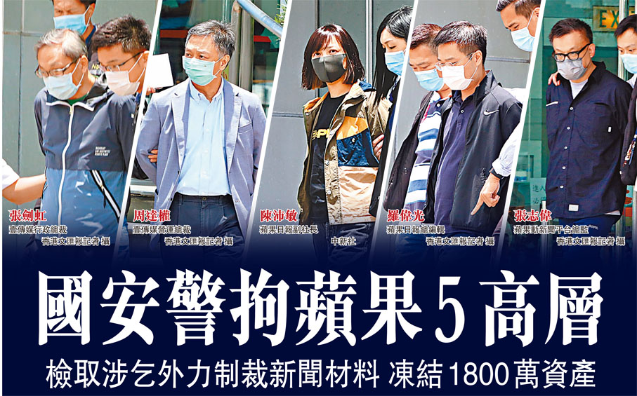 香港警務處國安處繼去年8月拘控壹傳媒創辦人黎智英,並搜查他旗下蘋果日報大樓後,昨日再度以涉嫌串謀勾結外國或者境外勢力危害國家安全罪,拘捕蘋果5名高層,並搜查蘋果大樓,檢取大批涉案新聞材料等證物書,凍結蘋果日報旗下3間公司約1,800萬元資產。警方調查發現,《蘋果日報》自2019年至國安法實施後,發表近60篇鼓吹及乞求外國勢力制裁香港特區以至中央政府的文章,有計劃地危害國家安全,故依法採取一切必要措施予以打擊。據悉,警方今次蒐集充足證據,不排除提出檢控及拘捕更多人。●香港文匯報記者 蕭景源