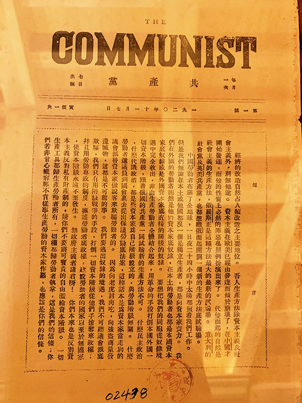 《共產黨》月刊創刊號則是此次展覽中最令觀眾振奮的展品。詹洪閣介紹:「這份由上海共產主義小組創辦的刊物,在1920年創刊,這也是以共產黨命名的最早的中國共產黨的刊物。」在這本文獻的刊頭下,是由陳獨秀撰寫的《短言》,他借此向全中國的勞動者發出警醒:「一切生產工具都歸勞動者所有,一切權都歸勞動者執掌,這是我們的信條。」