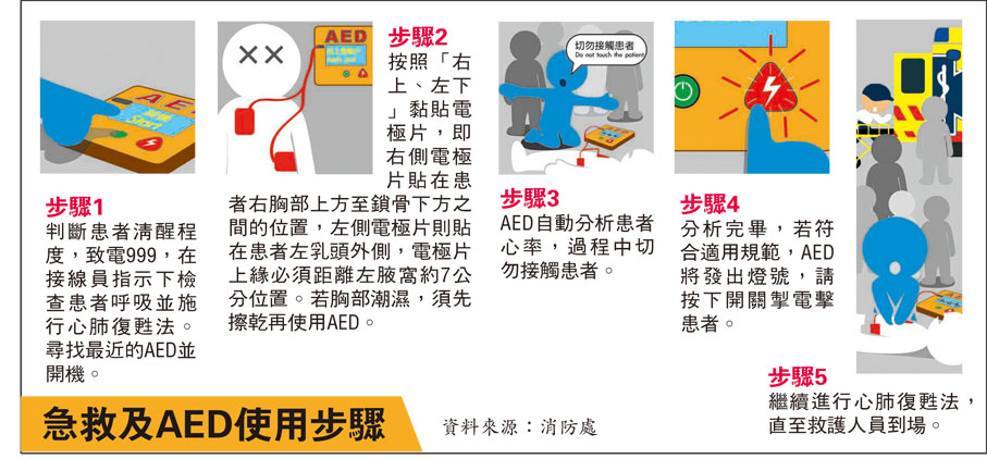 香港文匯報訊(記者 邵昕)香港每年有超過6,000宗心臟驟停事故,近年個案更愈趨頻繁。若能把握短短3分鐘的黃金急救時機,並使用自動體外心臟除顫器(AED)及心肺復甦法,患者存活率可由平均2.3%增至最高逾70%。故消防處推出「AED睇得到 用得到」計劃,聯同政府部門及公私營機構,開放900部AED供公眾緊急使用,網絡已覆蓋全港消防局、部分商場及地鐵站,消防處並建立網上資訊平台方便市民尋找就近的AED。