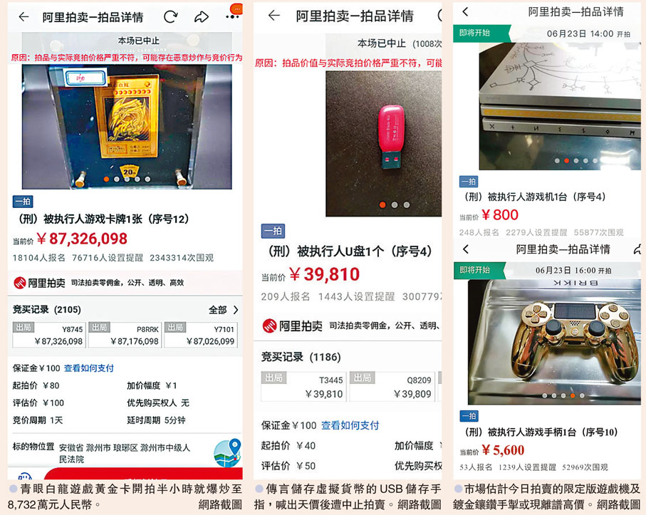 二次元文化在內地的受眾愈來愈廣,帶動相關產品價格不斷攀升,甚至掀起炒賣風。6月21日,安徽滁州中院在阿里拍賣上公開拍賣一張「青眼白龍」《遊戲王》純金遊戲卡,開拍半小時就從法院評估的80元(人民幣,下同)爆炒至8,732萬元天價,結果法院以惡意炒作為由中止拍賣。有不少網友認為,該卡當前市值逾20萬元,法院事前明顯嚴重低估其實際價值。隨後6月22日,屬同一執行人的USB儲存手指,評估價為50元,又被喊出近4萬元天價,最終亦遭到當局叫止。●香港文匯報記者 孔雯瓊 上海報道