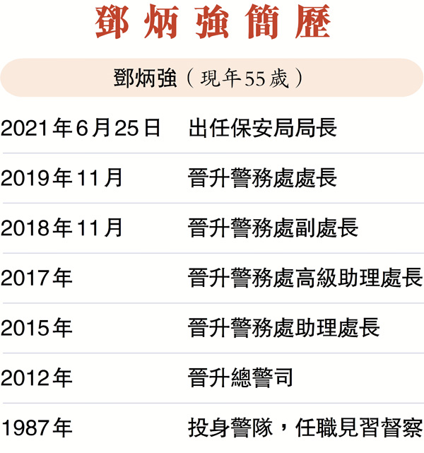 鄧炳強曾駐守多個單位,在刑事調查、國際聯絡事務及行動指揮方面經驗豐富,曾獲特區政府頒予香港警察卓越獎章和行政長官公共服務獎狀。他曾於內地和海外多所學院受訓,包括美國聯邦調查局國家學院、上海浦東幹部學院、中國人民公安大學、英國皇家國防學院及國家行政學院,持有工商管理碩士、國際安全及策略碩士等學位。 ●香港文匯報記者 鄭治祖