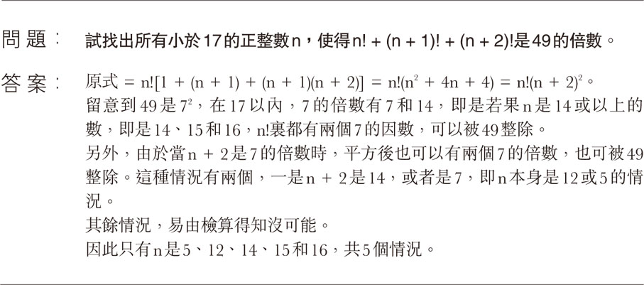 問 題:試找出所有小於17的正整數n,使得n! + (n + 1)! + (n + 2)!是49的倍數。