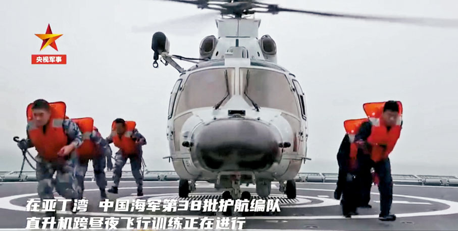 直升機夜間超低空搜索、懸停模擬索降、夜間航行中着艦……中國海軍第38批護航編隊在亞丁灣海域組織直升機跨晝夜飛行訓練,全面錘煉飛行員的飛行技術和心理素質,進一步提高編隊處置突發事件的能力。 ●文/圖:「央視軍事」微博公號