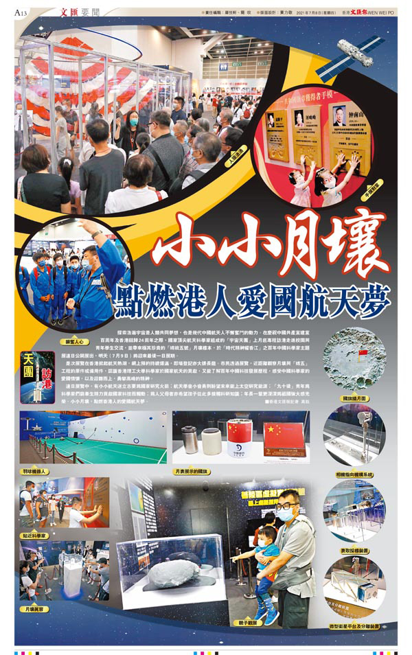 連日展覽中,有小小航天迷立志要為國家研究火箭;航天學會小會員則盼望未來能上太空研究能源;「九十後」青年為科學家們窮畢生精力貢獻國家科技而觸動;為人父母者亦希望孩子從此多接觸科研知識;年長一輩更深深為祖國強大感光榮。小小月壤,點燃香港人的愛國航天夢。 ■香港文匯報記者 高鈺