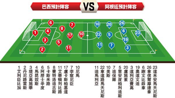 此外,阿根廷的防守在今屆大賽亦明顯不及巴西穩健,上場面對攻力疲弱的哥倫比亞也差點多次失守;因此球隊今場唯一寄望的,可能是比賽未能分出勝負要互射12碼;在上場4強比賽,阿根廷門將馬天尼斯一口氣救出3球12碼,表現甚有1990年世界盃臨危授命,但卻多次救出12碼的前輩哥高查的影子,如今場決賽真的要射12碼分勝負,那阿根廷就會變成值得看好的一方。