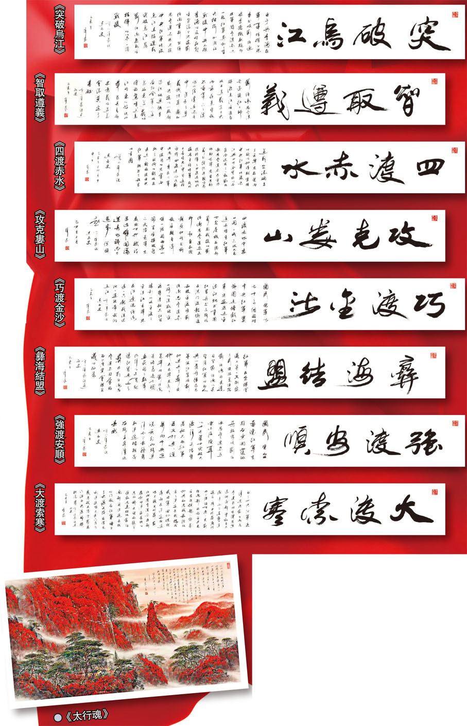 在梳理紅軍長征過程中血與火的征程以及父親帶兵行軍足跡時,從事過軍事研究的劉蒙只用時一個月就豪邁提筆寫出《突破烏江》、《智取遵義》、《四渡赤水》、《攻克婁山》、《巧渡金沙》、《彝海結盟》、《強渡安順》、《大渡索寒》八幅書法作品。三年前,系列作品均在北京《萬水千山總是情》展覽上集體展出。觀者無不紛紛讚歎:氣勢豪邁,激盪人心。