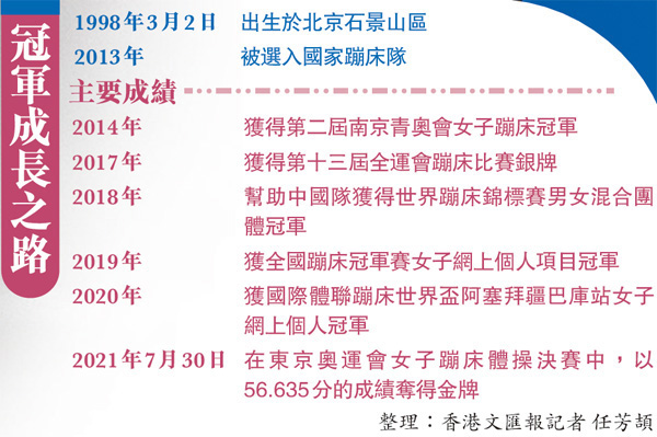 香港文匯報訊(綜合記者任芳頡、張聰及澎湃新聞報道)平時訓練之餘,女子蹦床(港稱彈床)冠軍朱雪瑩就喜歡在自己就讀的北京體育大學校園散步,「在西南門那邊會有一個冠軍之路,地上印的全是世界冠軍或者奧運冠軍的腳印,每次當我蹓躂到那邊的時候,我心裏就會想--什麼時候學校也能留下我朱雪瑩的腳印。」這是朱雪瑩最真實的獨白。在30日的東京奧運的蹦床賽場上,朱雪瑩10個動作都非常出色地完成了,解說非常興奮地說:「朱雪瑩這一跳是超水平的,能在奧運會這樣的大賽上有這樣的表現太棒了。」時隔13年,中國隊昨日再次奪得奧運會蹦床女子金牌。23歲的北京姑娘圓夢了,她和隊友劉靈玲包攬了蹦床金銀牌。
