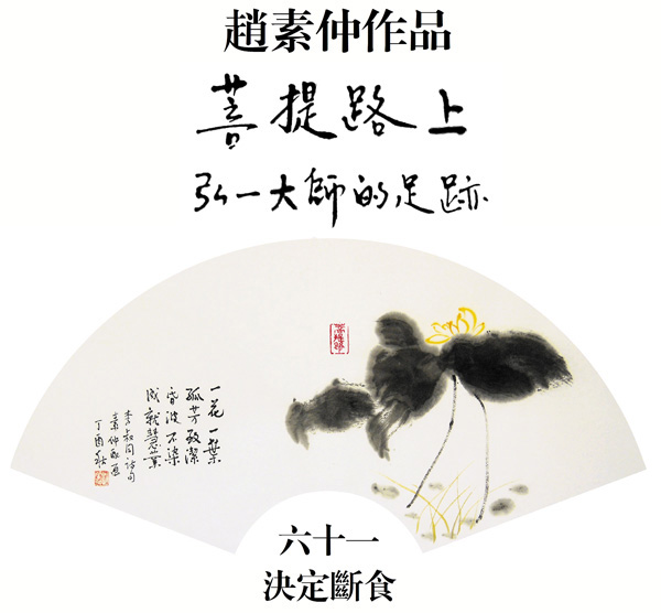 1916年冬天,李叔同決定往杭州虎跑定慧寺斷食17日,這是他經過深思而作的決定。他找出1913年,陳師曾畫給他的荷花小幅展玩,想到自己即將入山坐禪,於是在畫上題此詩以自勉。