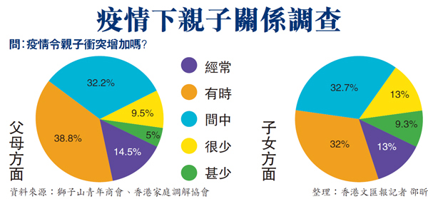 新冠肺炎疫情期間,居家辦公及網上授課成為疫下新常態,令家長與子女在家相處的時間大幅增加,工作、學習被迫困在小小空間內,外出活動減少,摩擦與壓力激增,「困獸鬥」下親子關係更易爆煲。有調查發現,53%受訪家長指疫情下親子衝突增加,近60%受訪子女曾用傷害自己或他人方式處理壓力問題,包括服食安眠藥及鎅手等。專家呼籲,面臨親子關係應及時尋求幫助,親子雙方應學習以開放、接納的態度溝通,及早化解矛盾。●香港文匯報記者 邵昕