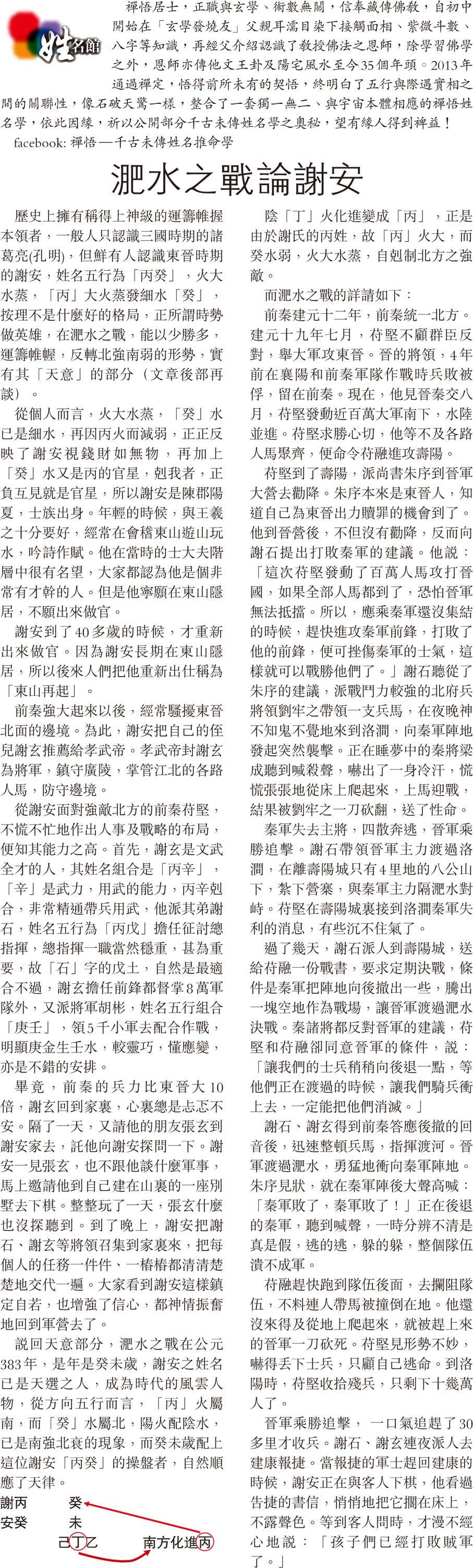 說回天意部分,淝水之戰在公元383年,是年是癸未歲,謝安之姓名已是天選之人,成為時代的風雲人物,從方向五行而言,「丙」火屬南,而「癸」水屬北,陽火配陰水,已是南強北衰的現象,而癸未歲配上這位謝安「丙癸」的操盤者,自然順應了天律。