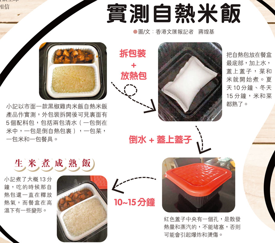 把自熱包放在餐盒最底部,加上水,蓋上蓋子,菜和米就開始煮。夏天10分鐘、冬天15分鐘,米和菜都熟了。