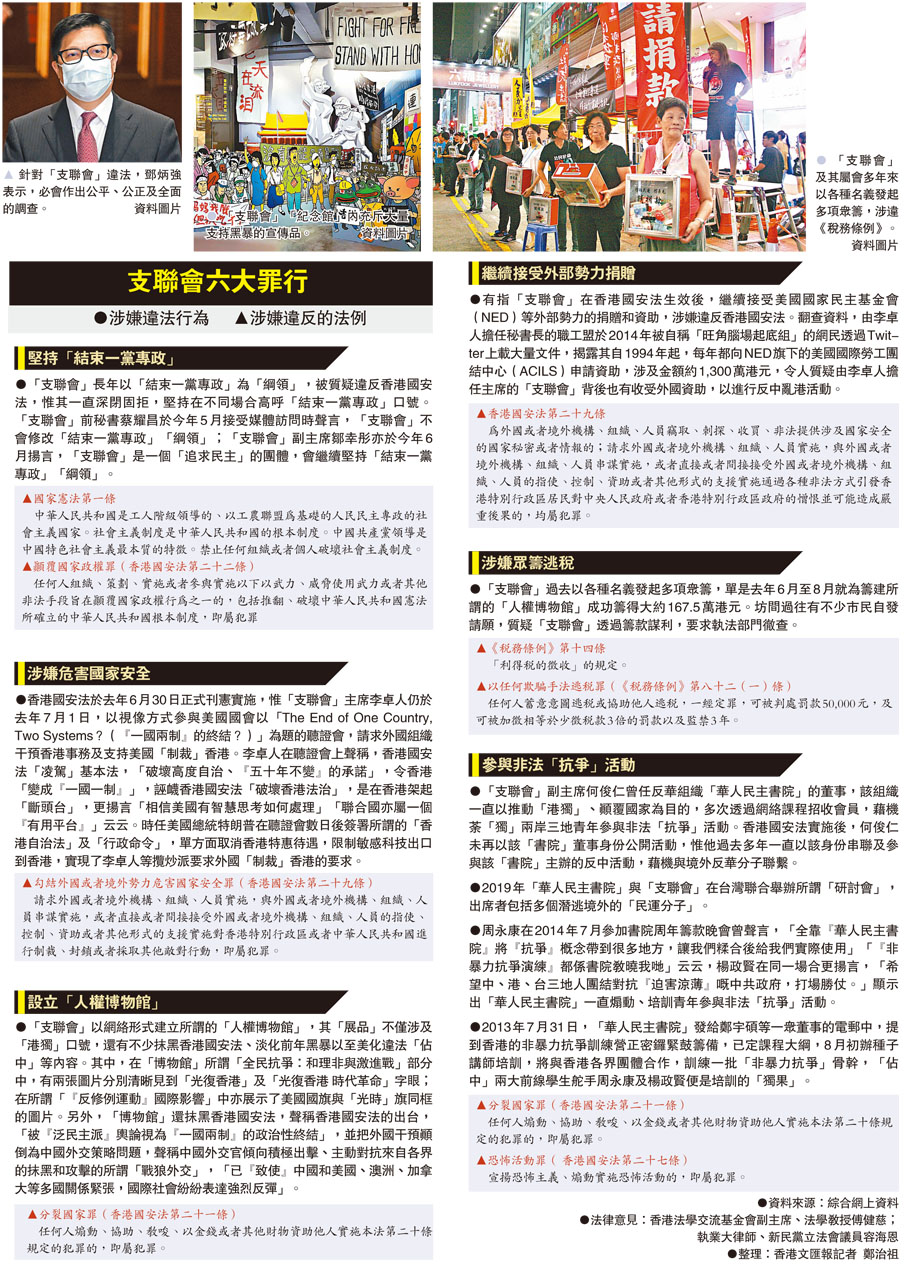 一直煽動香港市民敵視中央政府的「支聯會」,在香港國安法實施後依然沒有收手,包括繼續高調宣傳其所謂「結束一黨專政」的「綱領」等,被質疑違反香港國安法。保安局局長鄧炳強前日表示,必會作出公平、公正及全面的調查。據消息透露,警方正跟進調查「支聯會」,包括其「綱領」及骨幹過往言行,與外部勢力的聯繫等,更將調查範圍擴大至各「支聯會」屬會,包括核查有關組織的社團登記及財務往來等。有法律界人士昨日接受香港文匯報訪問時指出,「支聯會」「綱領」、該組織及其骨幹過往的行徑涉嫌干犯香港國安法,而其屬會有可能構成「共同犯罪」,特區政府應依法取締,及追究其法律責任。●香港文匯報記者 鄭治祖