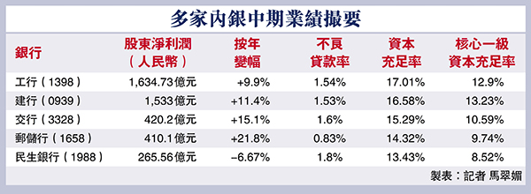 受惠於去年受疫情影響帶來低基數效應,內銀今年上半年業績紛紛報捷,工行(1398)、建行(0939)和交行(3328)上半年利潤都錄得增長,同時資產質量也有改善。其中工行中期多賺9.9%至1,634.73億元(人民幣,下同),達市場預期上限,期內資產質量持續改善,不良率、逾期率「雙降」,不派中期息。●香港文匯報記者 馬翠媚