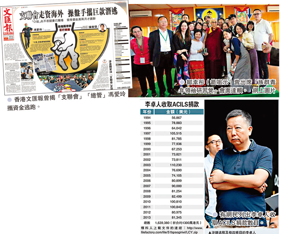 「支聯會」主席李卓人同時為職工盟的秘書長,於2014年10月爆發違法「佔中」後不久,自稱「旺角腦場起底組」的網民透過Twitter上載大量文件,揭露職工盟自1994年起,每年均向「NED」旗下的「美國國際勞工團結中心(ACILS)」申請資助,涉及金額約1,300萬港元。