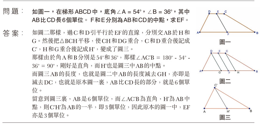 問 題:如圖一,在梯形ABCD中,底角∠A = 54o,∠B = 36o,其中AB比CD長6個單位。 F和E分別為AB和CD的中點,求EF。