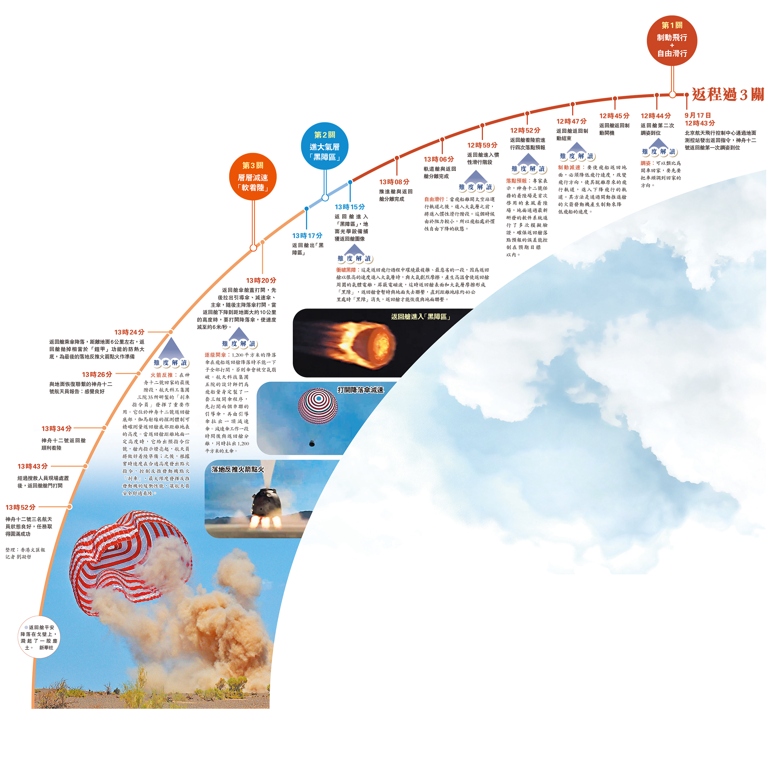 隨後,返回艙進入最令人驚心動魄的黑障區,這也是飛船返回過程中環境最為惡劣的階段。空氣密度越來越大,返回艙與空氣劇烈摩擦,使其底部溫度高達上千攝氏度,返回艙周圍被火焰所包圍。兩分鐘後,返回艙順利出黑障區,13時20分左右,返回艙在空中打開降落傘,徐徐下降。紅白相間的降落傘吊掛着黑褐色的返回艙,在空中劃出一道斜線,伴隨着濺起的一股塵土,平安降落在戈壁上。接收到返回艙着陸消息後,着陸場地面工作人員開車從四面八方趕往着陸地點,戈壁灘上揚起一道道塵土。耳畔傳來「隆隆」聲,只見數架直升機在天空盤旋。