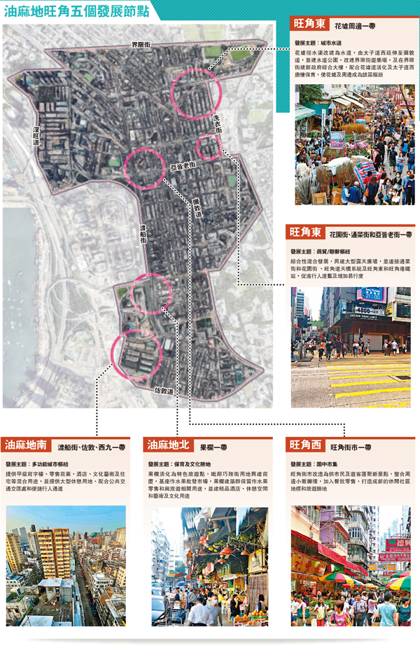 油旺市區重建步伐緩慢,政府在過去20年只簽發53份入伙紙。為此,研究提出對重建油旺地區的願景,將油旺地區分為5個不同主題的「市區更新潛力地區」,包括增強旺角東獨特的商業活力和特色,成為「步行娛樂和購物目的地」;透過強化亞皆老街沿線的商業或零售用途,提升社區的混合土地用途特色,及把旺角東的購物網絡延伸至旺角西,並鞏固向南發展的社區歸屬感,從而在旺角西創建一個獨特的「休閒商業和混合土地用途社區 」;逐步淘汰傳統工業用途,推動綜合社區發展和綠化空間,以改善大角咀及太子地區的生活環境,成為「綠悠社區」; 善用區內廣泛的歷史文化資源,進一步豐富區內濃郁的歷史文化特色,在油麻地北打造一個「保育及文化勝地」;在油麻地南創造一個獨特的「多功能城市樞紐」,作為西九龍新發展的延伸,提供商業和混合式用途。