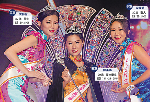 香港文匯報訊(記者 達里、阿祖) 《亞洲小姐競選2021》香港區決賽昨晚假亞洲電視1號錄影廠舉行,16位亞姐佳麗爭逐后冠及接近一百萬獎品,最終三甲順利誕生,雙料冠軍11號陳美儀兼得「最完美體態獎」、亞軍4號袁群有及季軍17號梁欣娟、「才華飛越大獎」6號陳美濤、「個人風格大獎」5號譚夢娜、「友誼小姐」及「最具潛力主持獎」由16號洪蓉蓉兼得、「網絡人氣大獎」3號林海茵、「美麗傳承大獎」1號紀樂詩、「最上鏡小姐」10號孫伊及特別頒發「2021亞洲小姐最佳努力獎」予人氣高企的亞視藝人薛影儀。