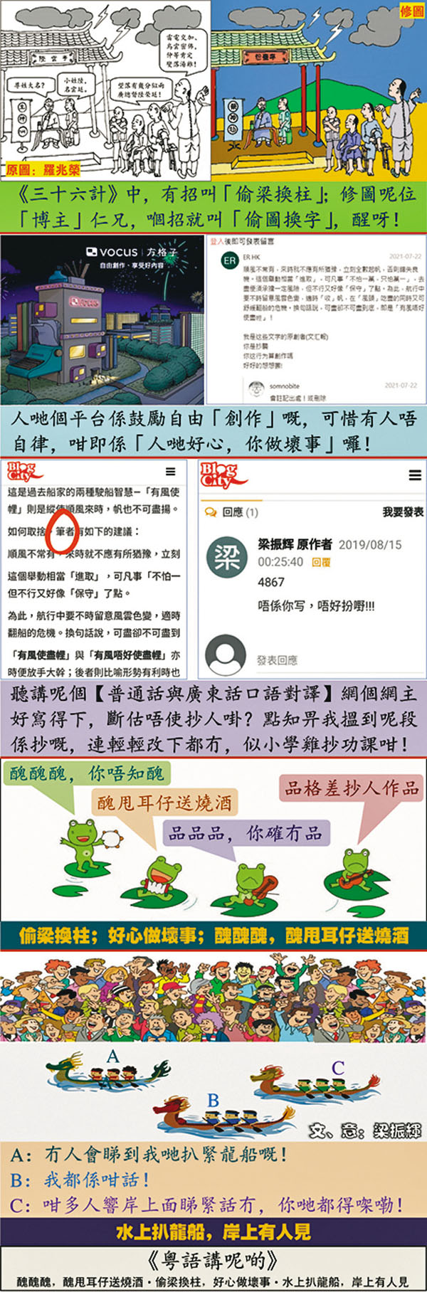 在「有風使盡?」和「有風唔好使盡?」這兩個議題上,筆者曾在本欄提出了尚算精闢的見解。及後筆者發現港台兩地有兩個有點頭面的網站「原文收錄」了上述的內容。為遏止侵權變成合理化,筆者一直會向對筆者侵權的個體或單位作出嚴正交涉(如發現)。就今期的三位涉事者,第一位於留言中砌詞狡辯,算是「自我迷失」;第二位「方格子-somnobite」速刪去相關文字,算是「迷途知返」;第三位【普通話與廣東話口語對譯】(master曾-頭條網)則「睬你都傻」(置若罔聞),算是「執迷不悟」。