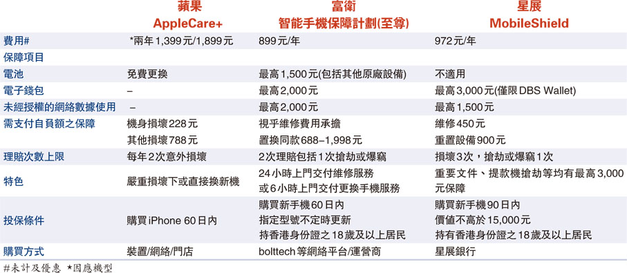 但有人要問,不是新機都有1年的保養期嗎?但意外損壞並不在Apple保養範圍內,所以如果不購買AppleCare+,就等於不能享用意外「爆MON」的優惠了,着實叫人在用新機時處處小心翼翼。那其他品牌的手機又有什麼選擇呢?其實市面上已經有多款針對智能手機的保險計劃,不僅能像AppleCare+一樣保障一定的維修費用,還增設了搶劫或爆竊、電子錢包、置換新機等保障,更加全面涵蓋了手機遺失或飛來橫禍等狀況。平時多有商務或休閒外出的果迷,也可以考慮這一類保障。