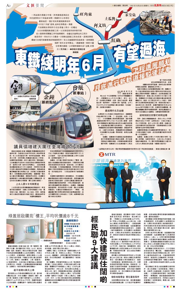 金澤培昨日公布最新工程進展時表示,港鐵團隊在過去數月努力不懈,「一直追落後,追得一日得一日」,令各項關鍵工程取得實質進展,預計東鐵綫過海段將於明年6月至7月正式投入服務,屆時現有東鐵綫的紅磡終點站會延伸至金鐘作新終點站,並途經新建於灣仔北的會展站,「通車後的東鐵綫將成為香港第四條過海鐵路,貫通新界東北、九龍中及香港島,東鐵綫乘客毋須轉綫即可直達灣仔北及金鐘一帶的商貿、會展及金融中心。」