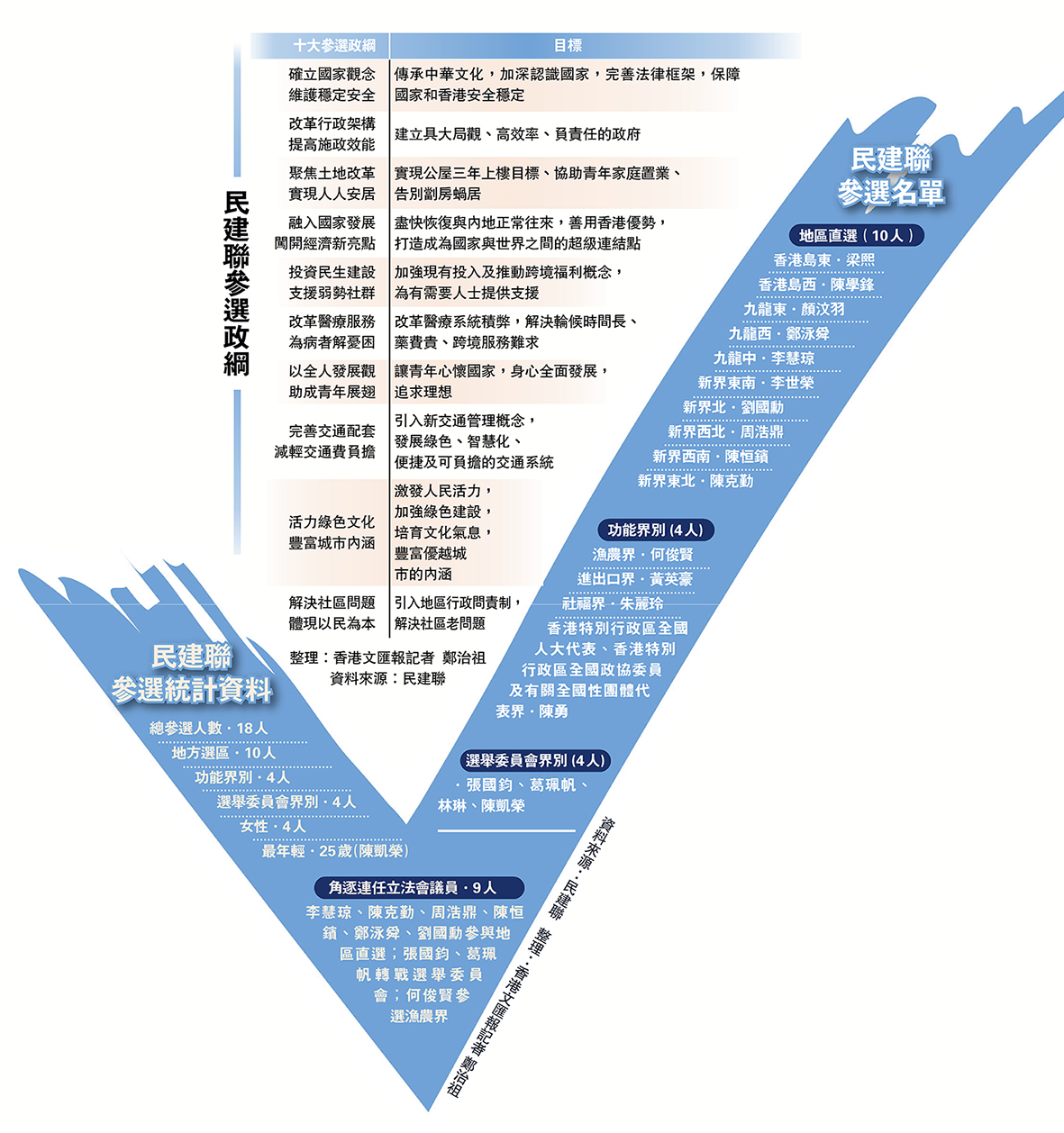 新增的選委會界別,民建聯將派出現任地區直選議員的張國鈞、葛珮帆轉戰,餘下兩名新人分別為前區議員林琳和執委陳凱榮。在功能界別方面,民建聯派出4人,何俊賢在漁農界競逐連任,黃英豪出選進出口界,社福界由選委朱麗玲出選。首次出選的港區全國人大代表、民建聯副主席陳勇則出選「港區人大代表、全國政協委員及全國性團體代表」界別。原任進出口界的黃定光退下火線,交棒予全國政協委員黃英豪。