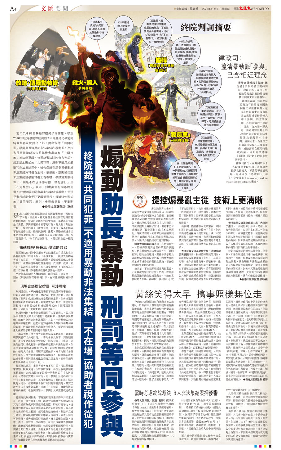 判詞還指出,單純身處現場並不招致任何刑事責任,但如身處現場透過言語、標記或行動提供鼓勵,則可被視為「參與」或協助及教唆暴動而被定罪,如曾協議共同參與非法集結或暴動,並預見實行計劃會干犯更嚴重罪行時,參與者就會根據延伸形式的「共同犯罪計劃」,或需負上更嚴重罪行的法律責任。