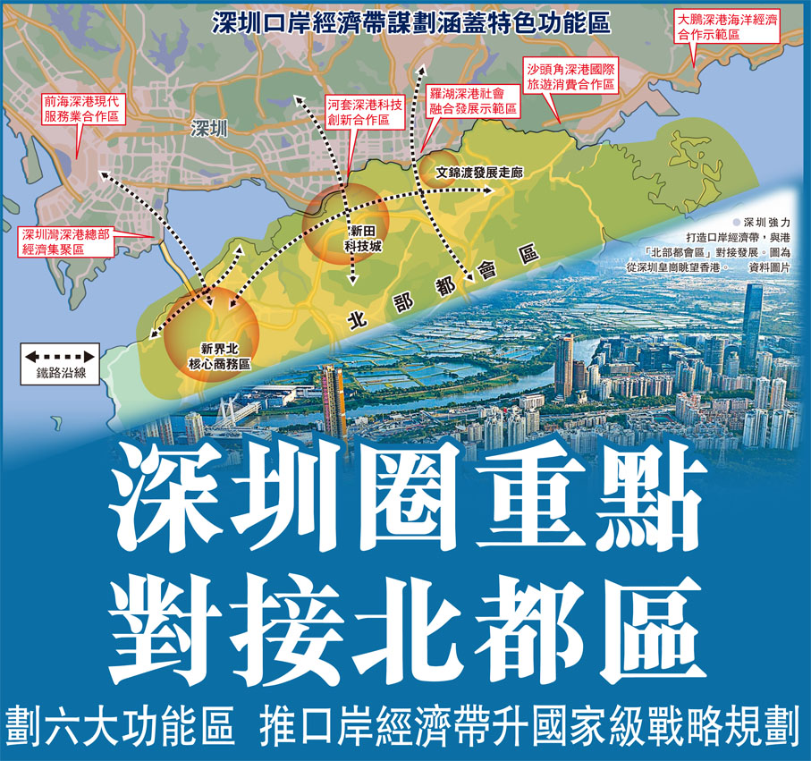 香港文匯報記者從消息人士處獲悉,深圳已經開展口岸經濟帶規劃研究,希望與香港新界北開發相結合,雙城聯動,重點聚焦現代服務業、總部經濟、科技創新、社會民生、旅遊消費、海洋經濟等領域開展深度合作,謀劃提出前海深港現代服務業合作區、深圳灣深港總部經濟集聚區、河套深港科技創新合作區、羅湖深港社會融合發展示範區、沙頭角深港國際旅遊消費合作區、大鵬深港海洋經濟合作示範區等一批空間統籌、結構優化、錯位協同的特色功能區,構築深港合作新紐帶,打造中國特色跨境經濟合作平台。