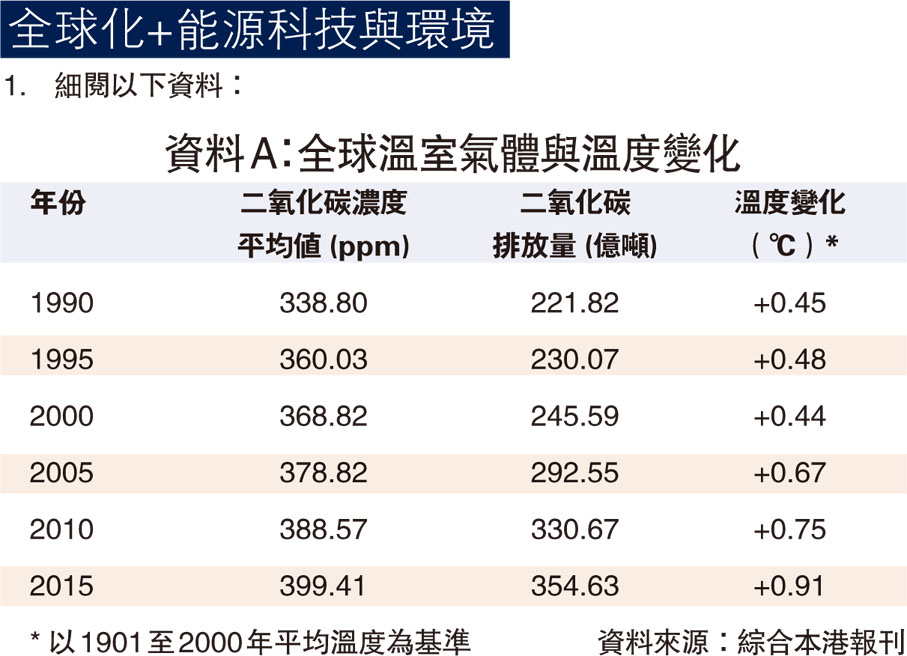 資料A:全球溫室氣體與溫度變化(見圖表)