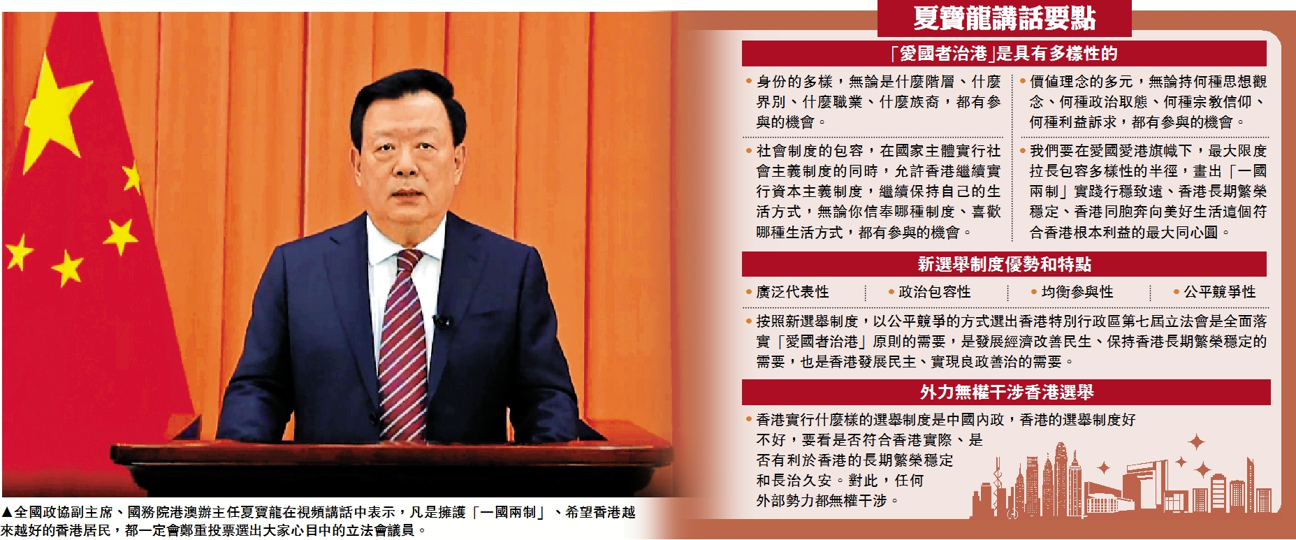 夏寶龍在題為《以史為鑒譜寫香港民主新篇章》視頻講話中強調,這兩年香港由亂到治的重大轉折充分證明,確保「一國兩制」實踐行穩致遠,必須始終堅持「愛國者治港」根本原則。只有真正把「愛國者治港」根本原則落到實處,香港才能實現長期繁榮穩定和長治久安,香港同胞才能實現對美好生活的嚮往與追求,並為實現中華民族偉大復興作出應有的貢獻。他表示,12月19日,香港特別行政區將依照香港基本法修訂的新選舉制度舉行第七屆立法會選舉,這對落實「愛國者治港」的原則、發展符合香港實際的民主、塑造香港良政善治新格局具有重要意義。