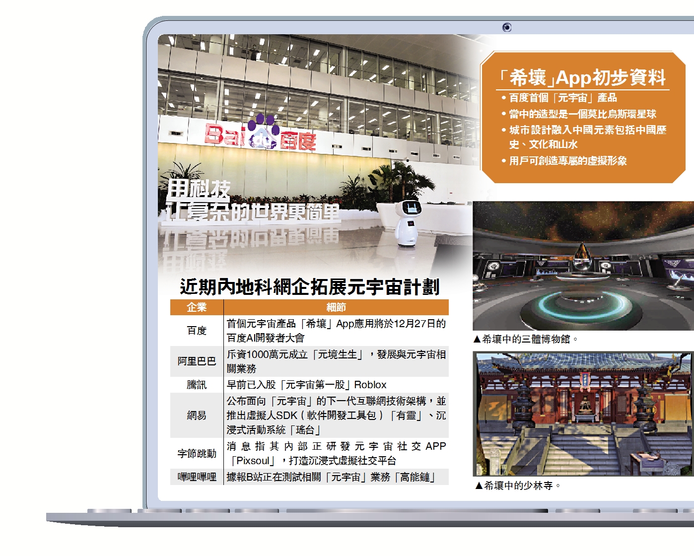 繼阿里巴巴(09988)成立子公司搶攻「元宇宙」(Metaverse)後,百度(09888)率先推出元宇宙產品「希壤」應用程式,用戶可透過專屬的虛擬形象置身其中。百度管理層認為,元宇宙尚處於非常初期的產業探索階段,需要時間讓各方構建,強調百度希望成為元宇宙引擎。\大公報記者 李清心