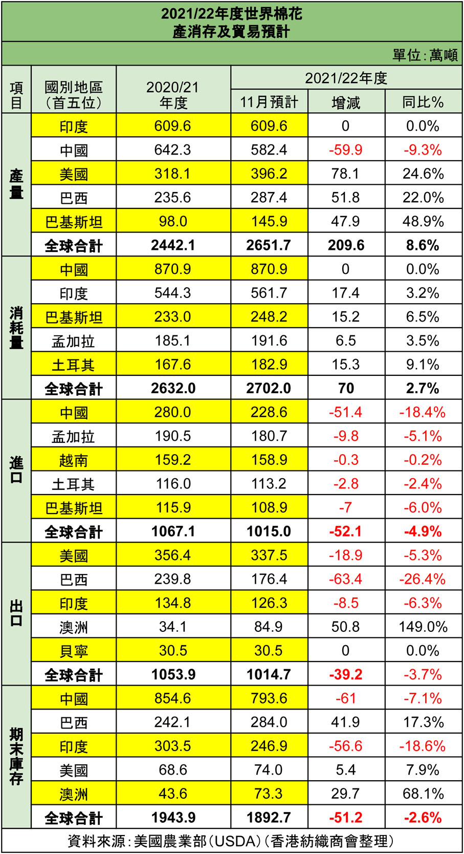USDA 11月公布全球棉花供需報告,調增2021/22年度全球棉花產量和消費量。具體特徵如下: