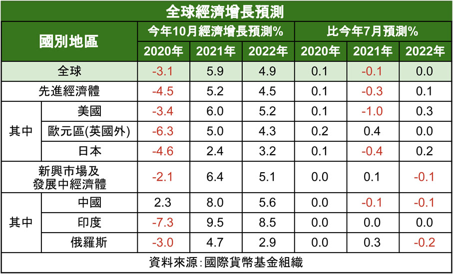IMF預計全球經濟將在2021年增長5.9%,較7月預測下調0.1個百分點。2022年預期則維持增長4.9%。IMF下調發達經濟體今年增長預期0.3個百分點至5.2%,原因是發達經濟體預測增速放緩,美國2021年經濟增長較7月預測數字大幅下調1個百分點,至6.0%;明年則上調0.3個百分點,預估為5.2%。歐元區2021年經濟增長率修正為5.0%,較7月時上修0.4個百分點。2022年則維持不變,仍是4.3%。日本2021年經濟增長率下修至2.4%,2022年則可望達到3.2%。