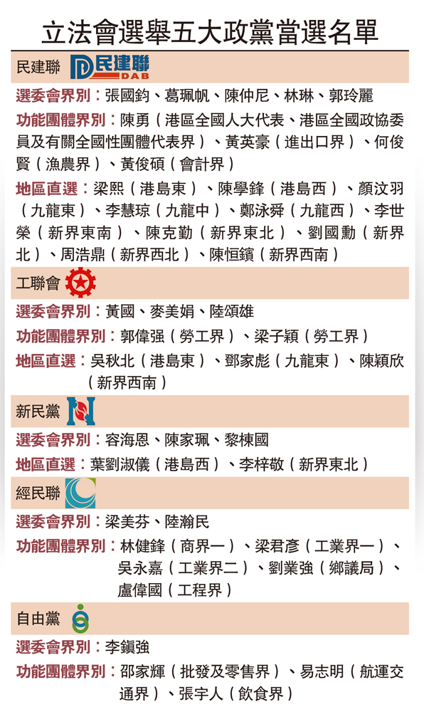 立法會選舉五大政黨當選名單