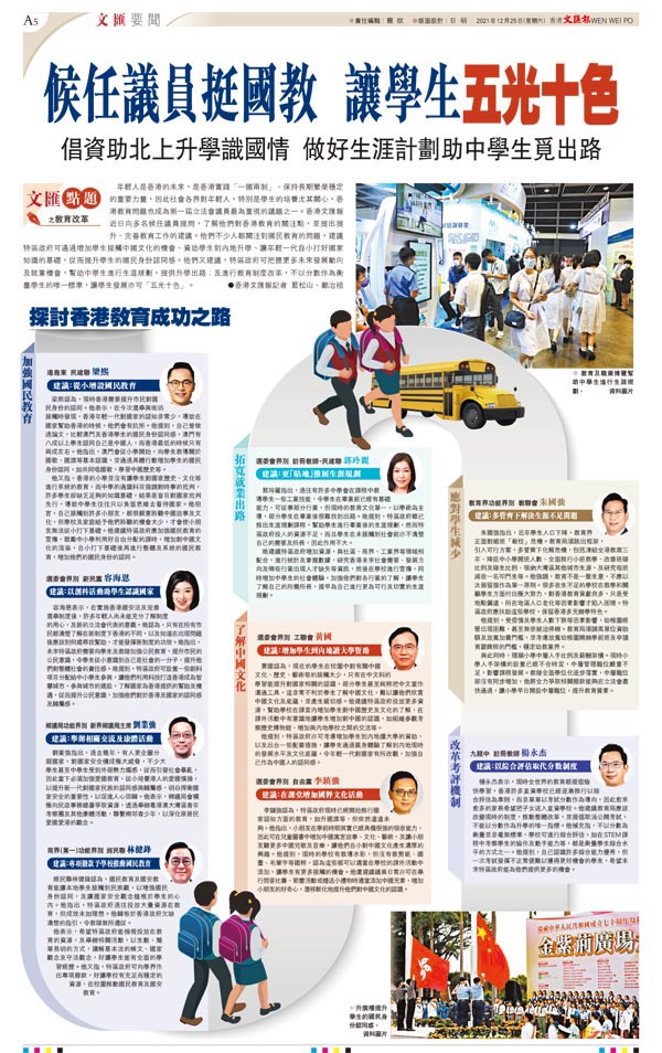 年輕人是香港的未來,是香港實踐「一國兩制」、保持長期繁榮穩定的重要力量,因此社會各界對年輕人,特別是學生的培養尤其關心,香港教育問題也成為新一屆立法會議員最為重視的議題之一。香港文匯報近日向多名候任議員提問,了解他們對香港教育的關注點,並提出提升、完善教育工作的建議。他們不少人都關注到國民教育的問題,建議特區政府可通過增加學生接觸中國文化的機會、資助學生到內地升學、讓年輕一代自小打好國家知識的基礎,從而提升學生的國民身份認同感。他們又建議,特區政府可把握更多未來發展動向及就業機會,幫助中學生進行生涯規劃,提供升學出路;及進行教育制度改革,不以分數作為衡量學生的唯一標準,讓學生發展亦可「五光十色」。 ●香港文匯報記者 藍松山、鄭治祖