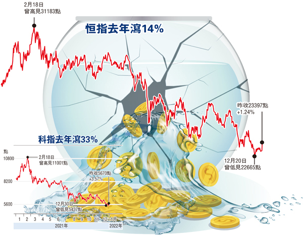 2021年最後交易日只有半日市,大市昨日承接中概股在美國出現強勁反彈,恒指曾高開441點,其後升幅逐步收窄,全日升285點,以23,397點報收,成交額577億元。整個2021年,恒指累跌3,833點或14.1%,跑輸全球主要市場,亦連跌第二年,港股總市值全年蒸發掉5.1418萬億元,至42.3812萬億元。科技股是昨日升市的火車頭,但全年來看則是跌市重災區,持有科技股的投資者大都要損手。恒生科指昨升3.6%報5,670點,全年則暴跌33%。國指昨升139點報8,236點,全年亦累跌23.3%。