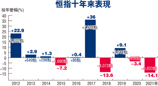 港股昨在2021年最後一個交易日,恒指以紅盤收官,升285點報23,397點。統計2021年,恒指累跌3,833點或14.1%,以幅度計為十年最差表現,為連跌第二年,也跑輸全球主要市場。科技股是全年跌市重災區,恒生科指全年暴跌33%,是全球發達市場最差指數。港股市值全年蒸發逾5.14萬億元,如果攤分到全港225萬名股民,相當每人賬面蝕228.5萬元,近乎人人輸掉半層樓。展望2022年,市場人士普遍認為港股風險已大幅減低。◆香港文匯報記者 周紹基
