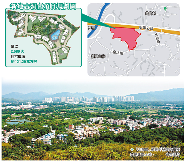 政府提出「北部都會區」願景,帶動周邊地區樓市發展,有發展商積極改劃北區土地。根據城規會文件顯示,新地就上水古洞南一幅土地作大型住宅發展,涉及14幢分層住宅,計劃興建2,589伙單位,較2019年獲批方案的單位數目(1,573伙)大增逾1,000伙,增幅達64.5%。單位大小亦作出改動,平均面積約468方呎。◆香港文匯報記者 黎梓田