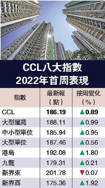 CCL在2022年開局報升,綜觀八大指數,除新界東之外,其餘七項指數齊揚。不過,本周公布的指數主要反映2021年12月13日至19日期間市況,當時有個別新盤向隅客回流二手市場,睇樓氣氛略為改善。其中,大型屋苑樓價指數報188.11點,按周升0.99%;中小型單位報185.94點,增長0.95%;大型單位報187.46點,反彈0.56%。