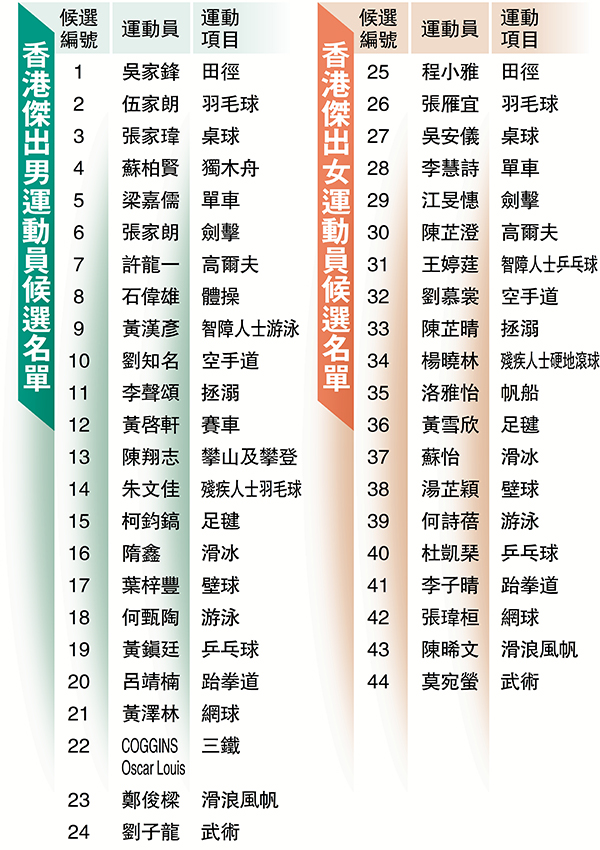 香港傑出運動員選舉接受公眾投票 張家朗何詩蓓星中之星大熱