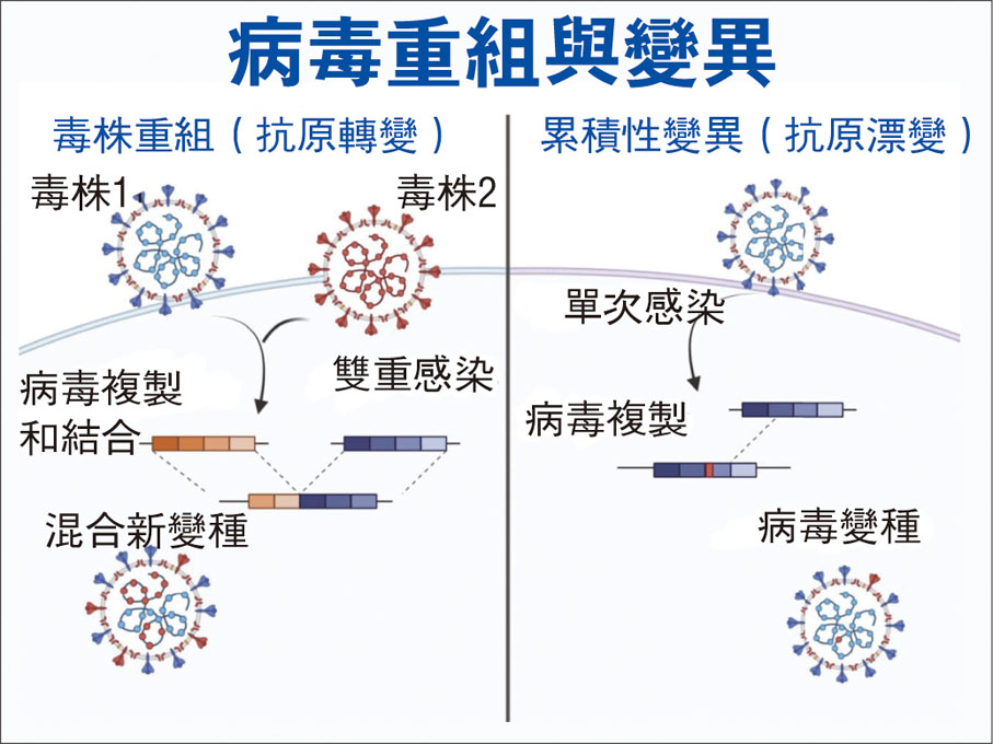 新冠病毒感染人體後,需要大量複製病毒核糖核酸(RNA)片段感染更多細胞。這一過程速度極快,難以避免不時出錯。若一個細胞同時感染兩種病毒株,RNA片段複製便可能出現類似「剪貼錯誤」,導致一種病毒RNA片段部分,被另一種病毒的片段覆蓋,由此重組產生新病毒。