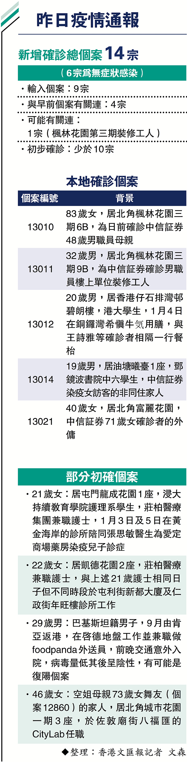 香港昨日新增14宗新冠肺炎確診個案,另有少於10宗初步確診個案,包括莊柏醫療集團兩名診所護士。衞生防護中心傳染病處主任張竹君昨日在疫情簡報會上表示,其中一名染疫護士是浸大學生,於本月3日及5日在黃金海岸商場診所分店陪同張思敏醫生診症。當時,東亞大藥房染疫東主的兒子求診,張醫生為他檢查喉嚨時未戴面罩,已送往檢疫中心,暫未呈陽性,而學護當時站在較遠處,最後上班日為本月11日。她已接種兩劑復必泰疫苗,本月12日出現病徵。