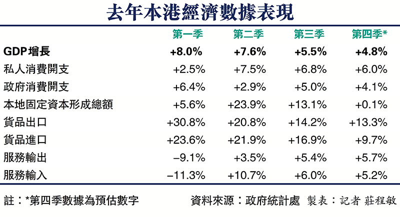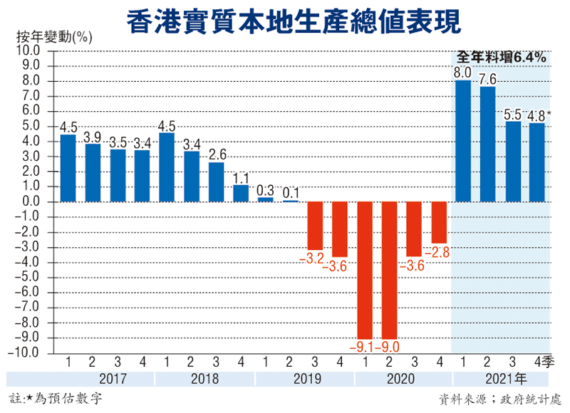 本港經濟在去年第四季復甦勢頭放緩,政府統計處昨公布預估數字,去年第四季本地生產總值按年實質上升4.8%,較第三季升5.5%放緩,並低於市場預測的升5%。去年全年則升6.4%,扭轉過去兩年的跌勢,符合政府預期,但仍然較2018年正常年份低約2個百分點。經濟動力方面,各主要構成部分的增長都有放緩情況,分析料今年經濟仍會有增長,但受到環球疫情不斷演變下的供應瓶頸,以及本港第5波疫情,今年經濟壓力非常大。 ◆香港文匯報記者 莊程敏