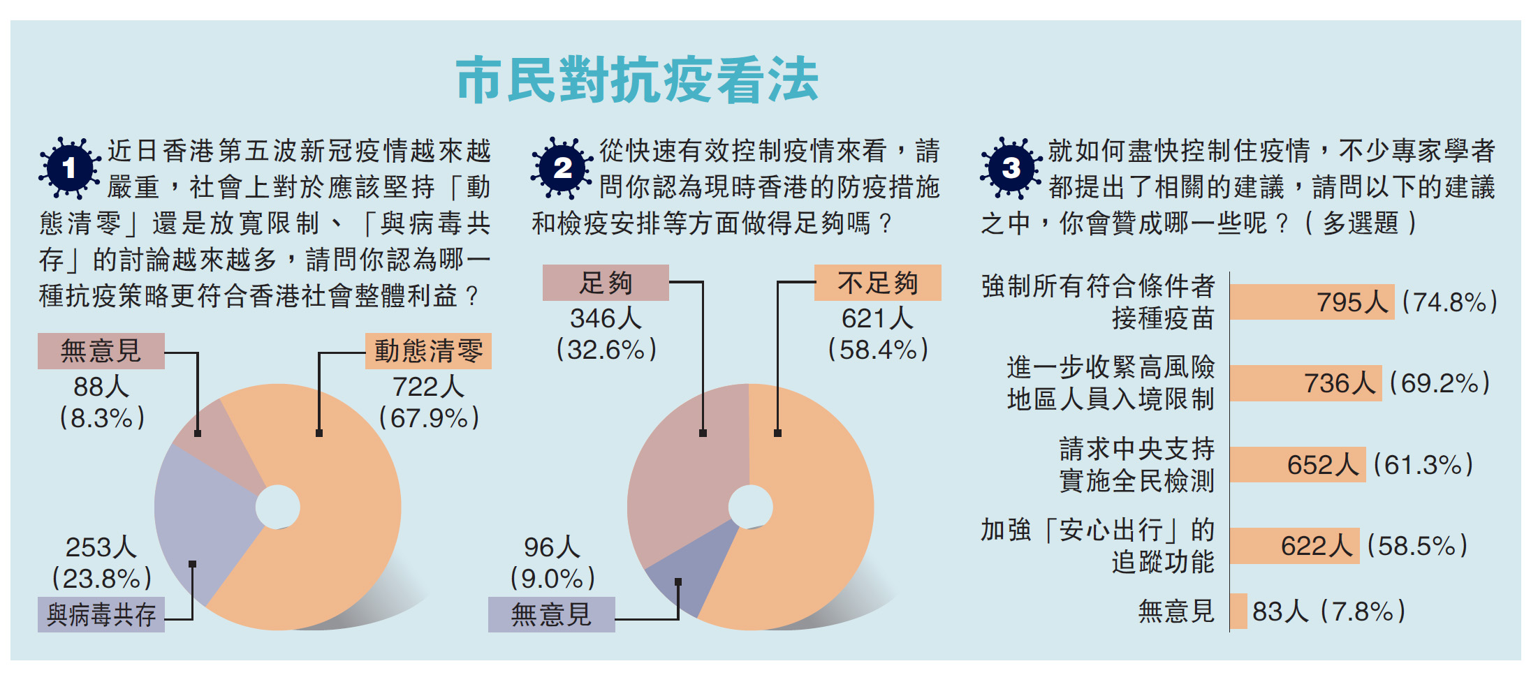 紫荊研究院於1月24日至28日期間,用電話隨機抽樣成功訪問了1063名市民,以了解受訪者對抗疫有關情況的看法。調查結果顯示,67.9%受訪者認為堅持「動態清零」策略更符合香港社會整體利益;近六成市民認為香港當前防疫措施和檢疫安排不足以快速有效控制第五波疫情。