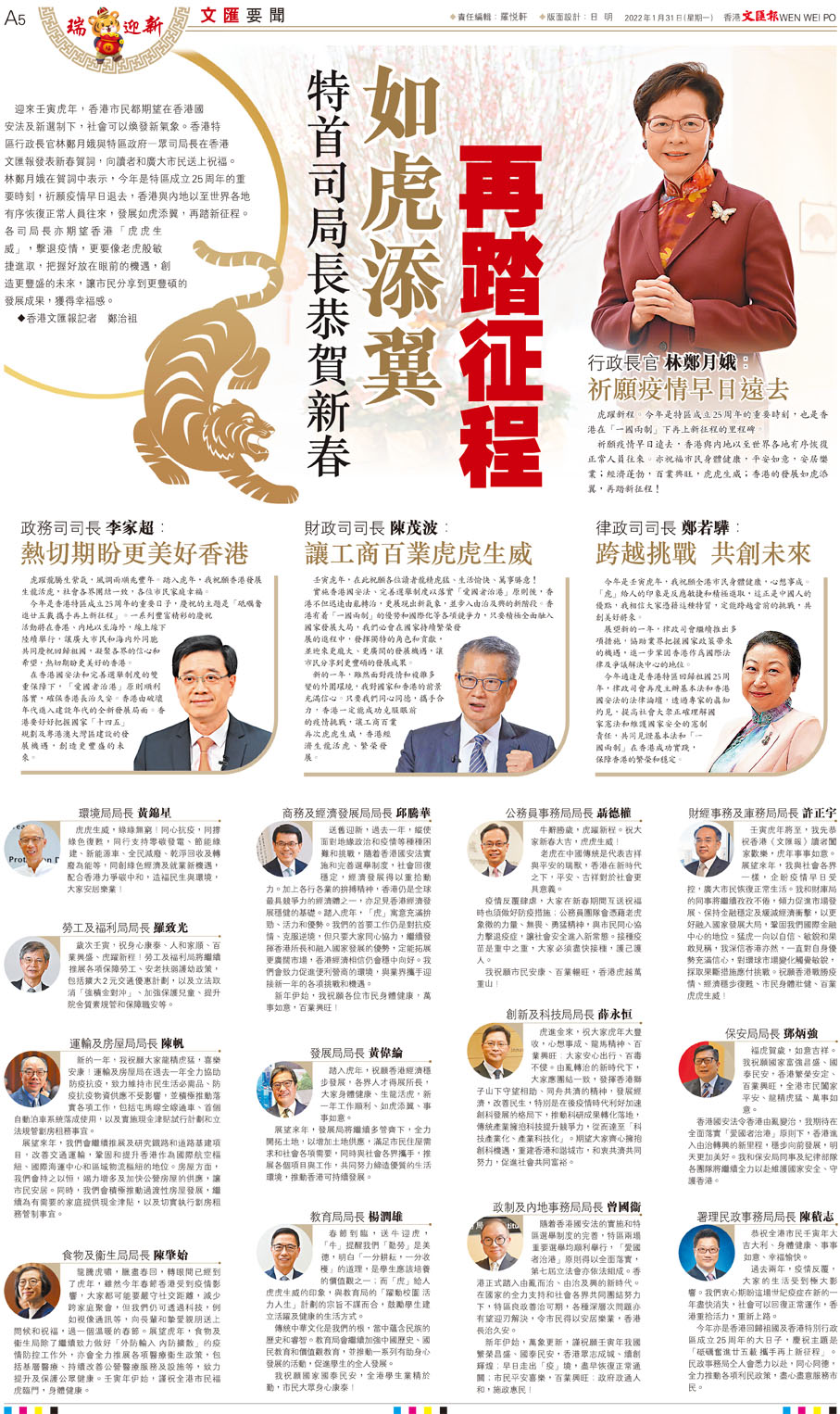 迎來壬寅虎年,香港市民都期望在香港國安法及新選制下,社會可以煥發新氣象。香港特區行政長官林鄭月娥與特區政府一眾司局長在香港文匯報發表新春賀詞,向讀者和廣大市民送上祝福。林鄭月娥在賀詞中表示,今年是特區成立25周年的重要時刻,祈願疫情早日退去,香港與內地以至世界各地有序恢復正常人員往來,發展如虎添翼,再踏新征程。各司局長亦期望香港「虎虎生威」,擊退疫情,更要像老虎般敏捷進取,把握好放在眼前的機遇,創造更豐盛的未來,讓市民分享到更豐碩的發展成果,獲得幸福感。 ◆香港文匯報記者 鄭治祖